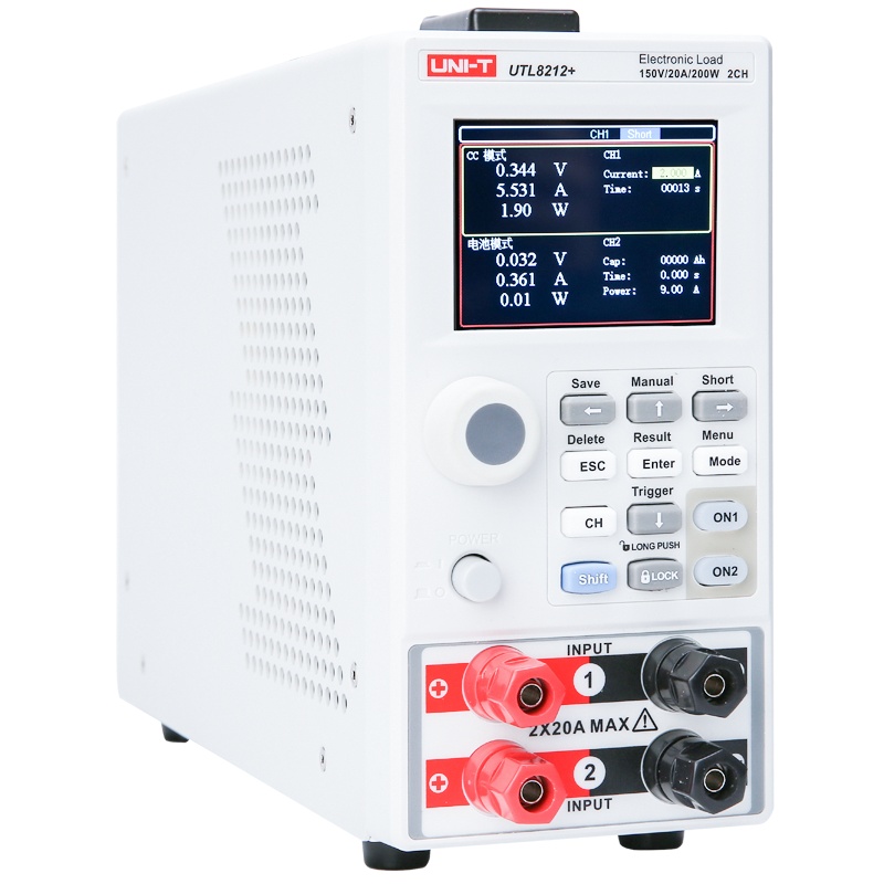 UTL8200+系列电子负载配有2.8英寸液晶显示屏,操作方便简洁,外观时尚大方,运行稳定,支持双通道完全独立测试,拥有较宽的功率测量范围,测试分辨率最高可达1mV/1mA,具备丰富的测试功能与模式,同时标配 RS-232C 通信接口,灵活满足各种现场测试条件,实现与自动化生产线、自动测试系统(ATS)无缝连接。