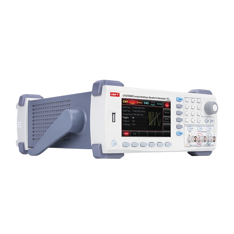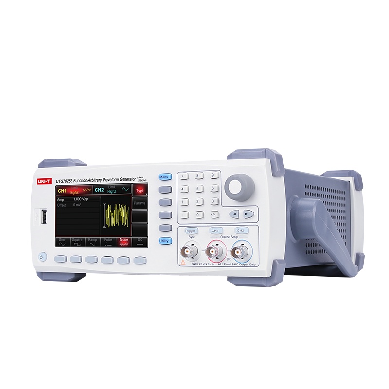 UTG7025B双通道函数/任意波形发生器,最大输出频率25MHz, 125MSa/s采样率,14bits垂直分辨率。等性能双通道独立输出,具备调制、扫频、Burst、等多种复杂波形的产生功能。标配USB Host、 USB Device接口,便捷高效的操作界面、优越的技术指标及人性化的图形显示。