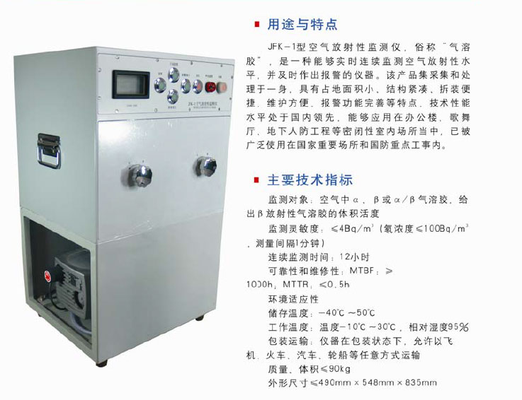 空气放射性监测仪,监测灵敏度≦4Bq/m3(氡浓度≦100Bq/m3,测量时间间隔1分钟),连续监测时间12小时,监测空气中的α、β或α/β气溶胶,报警功能。