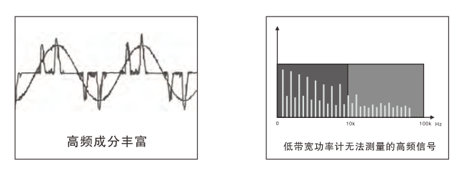 在测量正弦波时,如测试开关电源、变频家电等输入波形中含有丰富高频谐波成分时,功率计的测量频率范围及带宽不够的情况下,无法测试其高频谐波分量, PF330A系列能够保证在测试这类产品时,准确测量功率及功率因素。
